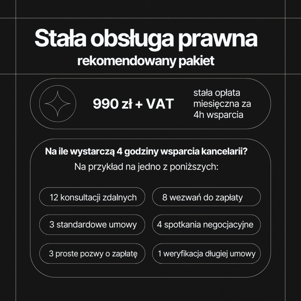 Obsługa prawna firmy obejmuje szereg działań, które mają na celu zapewnienie zgodności z przepisami, minimalizację ryzyk prawnych oraz wsparcie w bieżących decyzjach biznesowych. Do najczęstszych elementów obsługi należą: